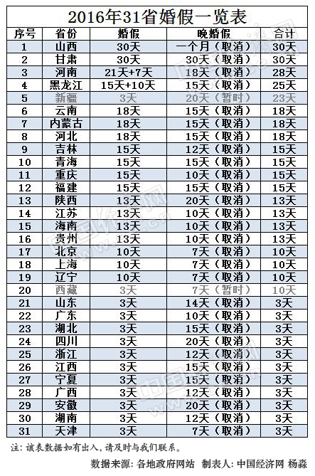 另外,还特别关注了河南省与黑龙江省,两个省份在修改本省的计生条例时对婚假的规定增加了对于参加婚前医学检查的夫妻增加婚假7天和10天的规定,使得河南省和黑龙江省婚假天数仅次于山西和甘肃。据中国经济网统计,河南可休28天,黑龙江婚假可以休25天。